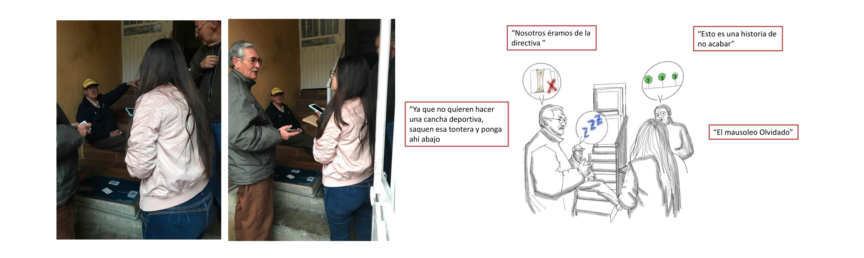 Finalmente, se aplicaron 4 grupos focales (Figura 6), en los que participaron personas de diferentes grupos etarios y género, en los que se dialogó a partir de un guion que procuraba crear un espacio de diálogo y debate sobre los usos y desusos de los espacios públicos, sobre los factores que han incidido en las dinámicas que los habitantes tienen con el espacio, y sobre las causas y consecuencias de las políticas públicas en la vida de la comunidad.