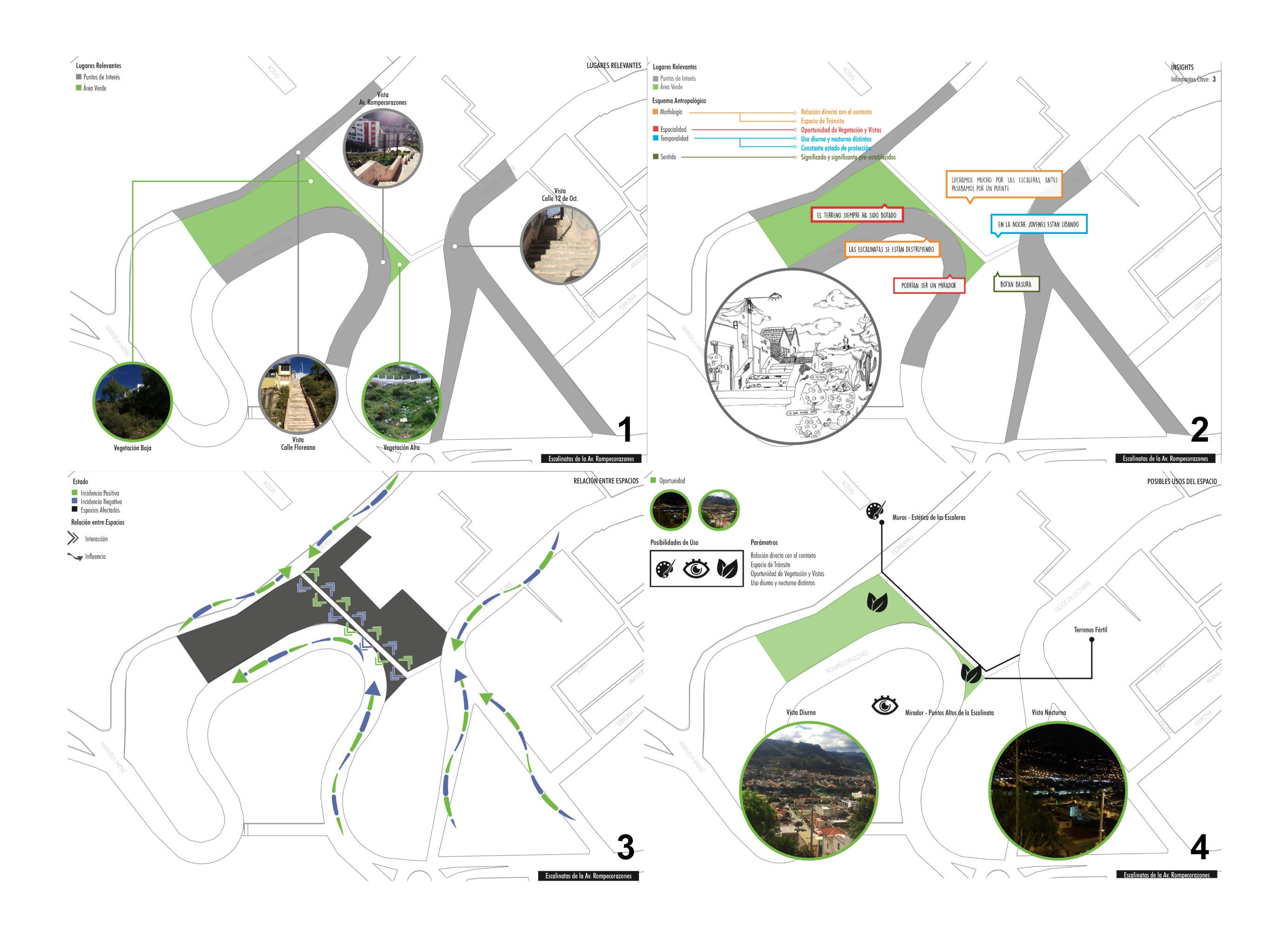 Figura 8. Mapas resultantes de la investigación: 1) Análisis histórico, 2) Relación con lugares relevantes, 3) insights, y 4) Relaciones entre espacios.