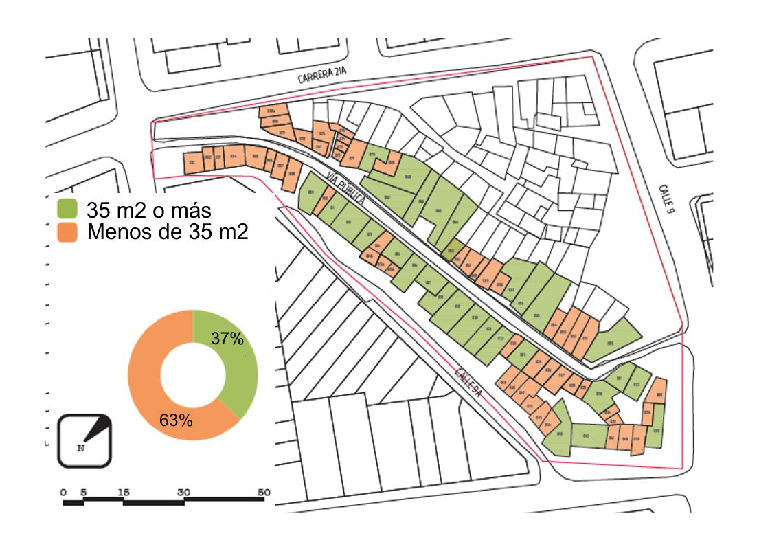 Una vez se logre la regularización del barrio procede la titulación de predios, lo que implica, entre otros aspectos, que el área construida de la edificación y registrada por el Instituto Geográfico Agustín Codazzi-IGAC tenga como mínimo 35 m2. En tal sentido, a partir del trabajo de campo realizado, se pudo determinar que en el asentamiento solo el 37% de las edificaciones cumplen con el área de construcción mínima antes mencionada (Figura 4). Estos actuales poseedores podrán optar por los derechos de titularidad sobre el predio y sus edificaciones —gozando de todos las cargas y beneficios correspondientes— a través de un procedimiento que debe realizarse ante una Curaduría Urbana.
