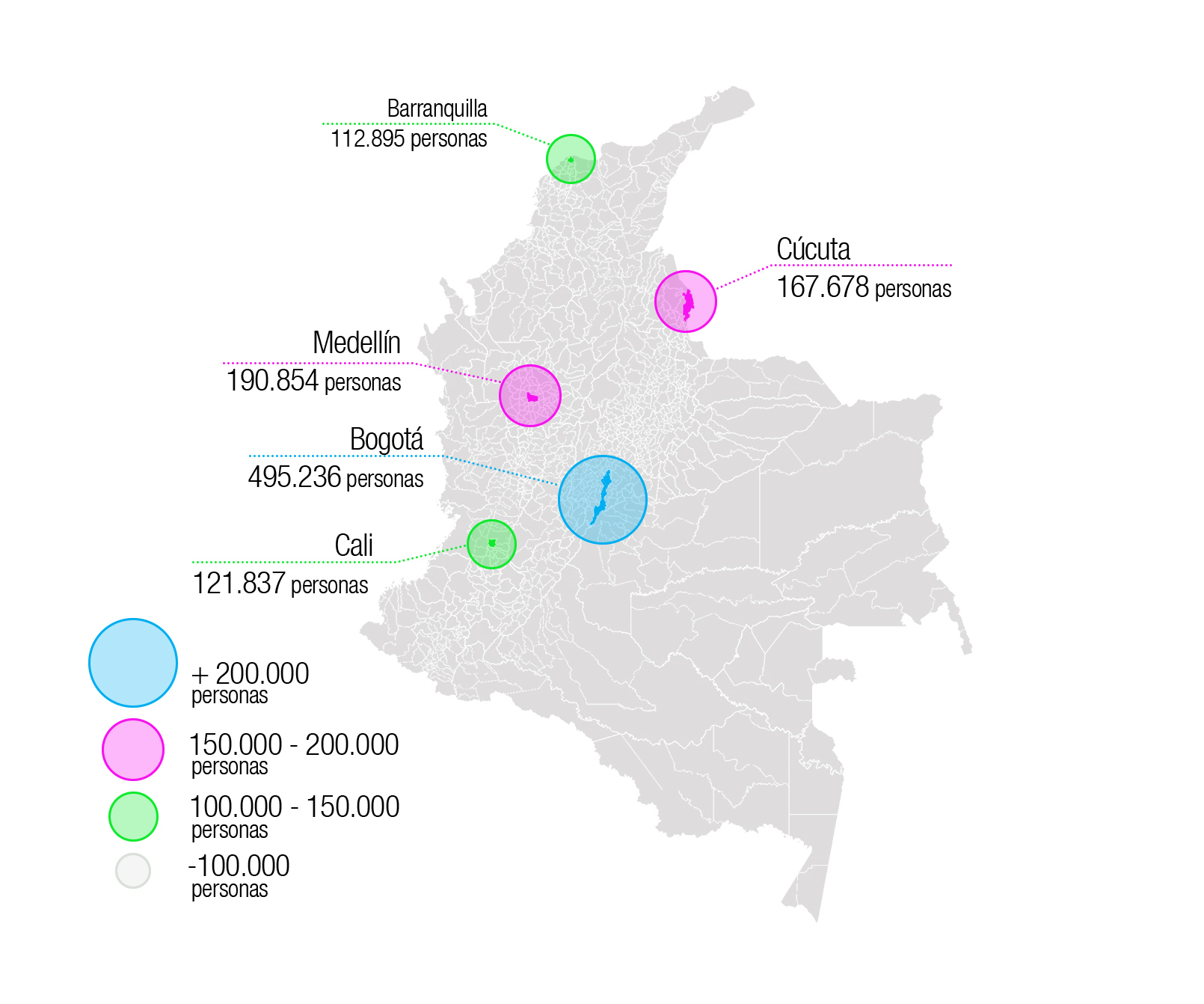 En febrero del año 2022 la distribución de venezolanos en las ciudades colombianas ha variado, en una proporción superior a las 100 veces en 8 años, llegando a ser 2 477 588 personas que se distribuyen en el territorio en diferentes situaciones y condiciones: de forma regular, 333 806; en procesos de estatuto temporal de protección, 1 231 675; autorizados, 617 069; y de forma irregular son 295 038 personas. Su distribución corresponde principalmente a ciudades y, cómo se pueden observar en la Figura 1, hay cinco ciudades que reúnen la mayor cantidad de población: Bogotá con 495 236; en Medellín 190 854; en Cúcuta 167 678; la ciudad de Cali con 121 837; y en Barranquilla 112 895 personas (Migración Colombia, 2022).