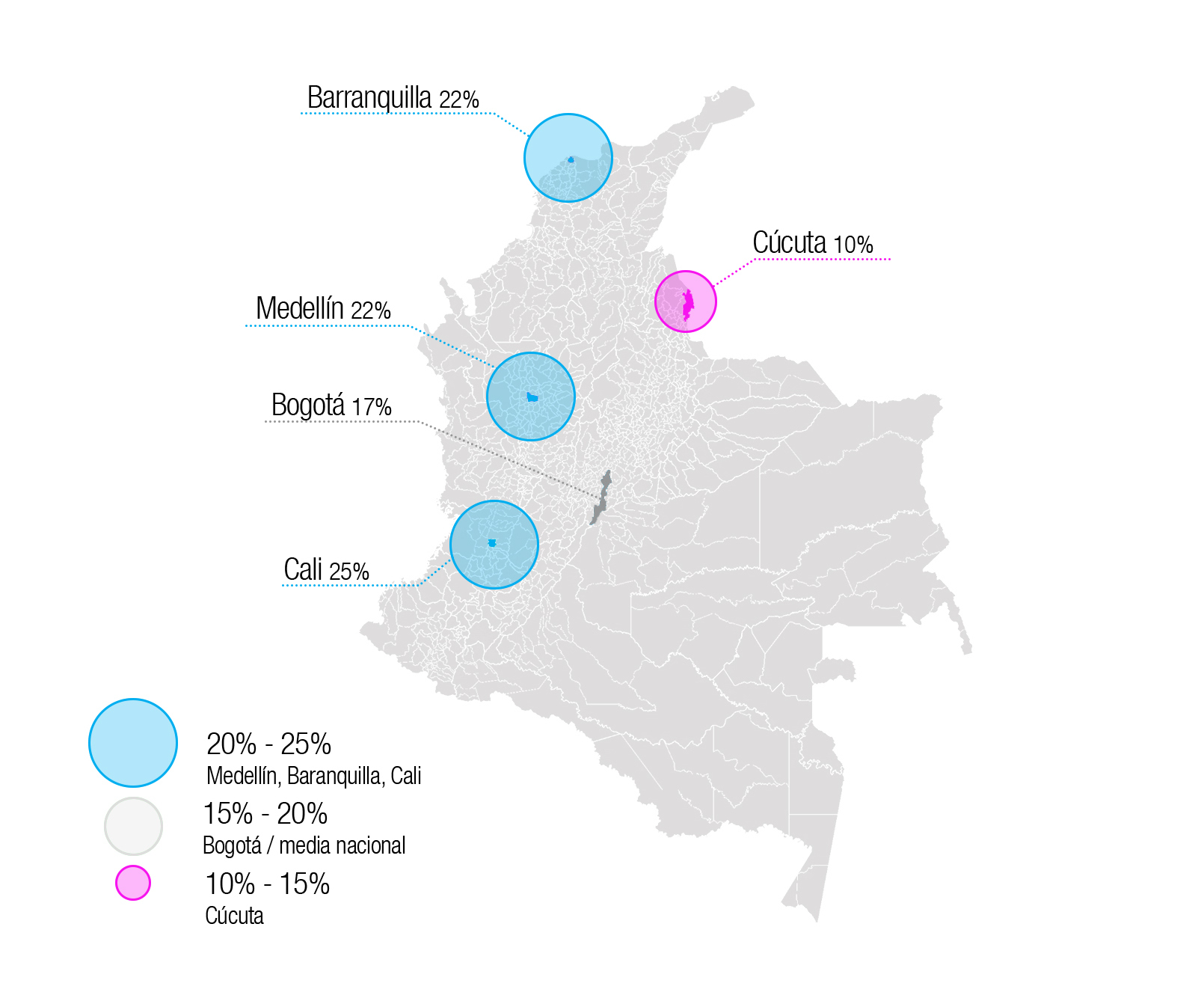 En el año 2021 se generó un marcado y destacable aumento de las conversaciones xenófobas a nivel nacional: durante el primer trimestre un 13% y para el segundo fue de 17% (Barómetro de xenofobia, 2021), de los cuales el 78% de estos mensajes se concentra en cinco ciudades colombianas, como se puede observar en la Figura 2. La ciudad con mayor índice de conversaciones xenófobas fue Cali con el 25%, seguida por Barranquilla con 22%, Medellín el 22%, Bogotá el 17% y Cúcuta con el 10% (Barómetro de xenofobia, 2021).