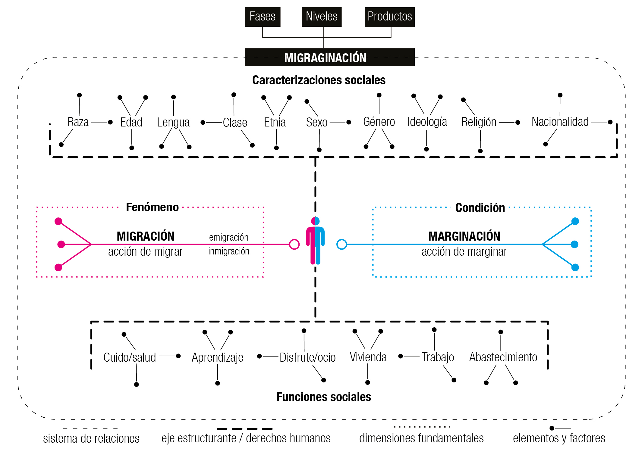The objective of this article is to recognize-understand the production of space which is generated by the dynamics between the migratory phenomenon and the marginalizing condition, underpinned by a concept called "migragination". This formulation is of a humanistic nature, since it is based on the social infrastructure that human rights imply; as well as of a geographical nature, understanding that it is developed in territories that are the product of human activity on the planet. Consequently, it is spatial, since it is contingent on the experiences, perceptions and conceptions that condition the two previous ones, while at the same time it is part of them, since there are no social relations without space, just as there is no space without social relations. A multidisciplinary qualitative methodology has been applied, which allows us to argue that "migration" is the result of a system that oppresses a person or group during their migratory process, marginalizing them either by their profile or social function, at some point or permanently. Finally, we hope that the theoretical formulation that emerges from this article will be useful in the construction of a critical reading of the reality of a large part of Latin America and the planet.