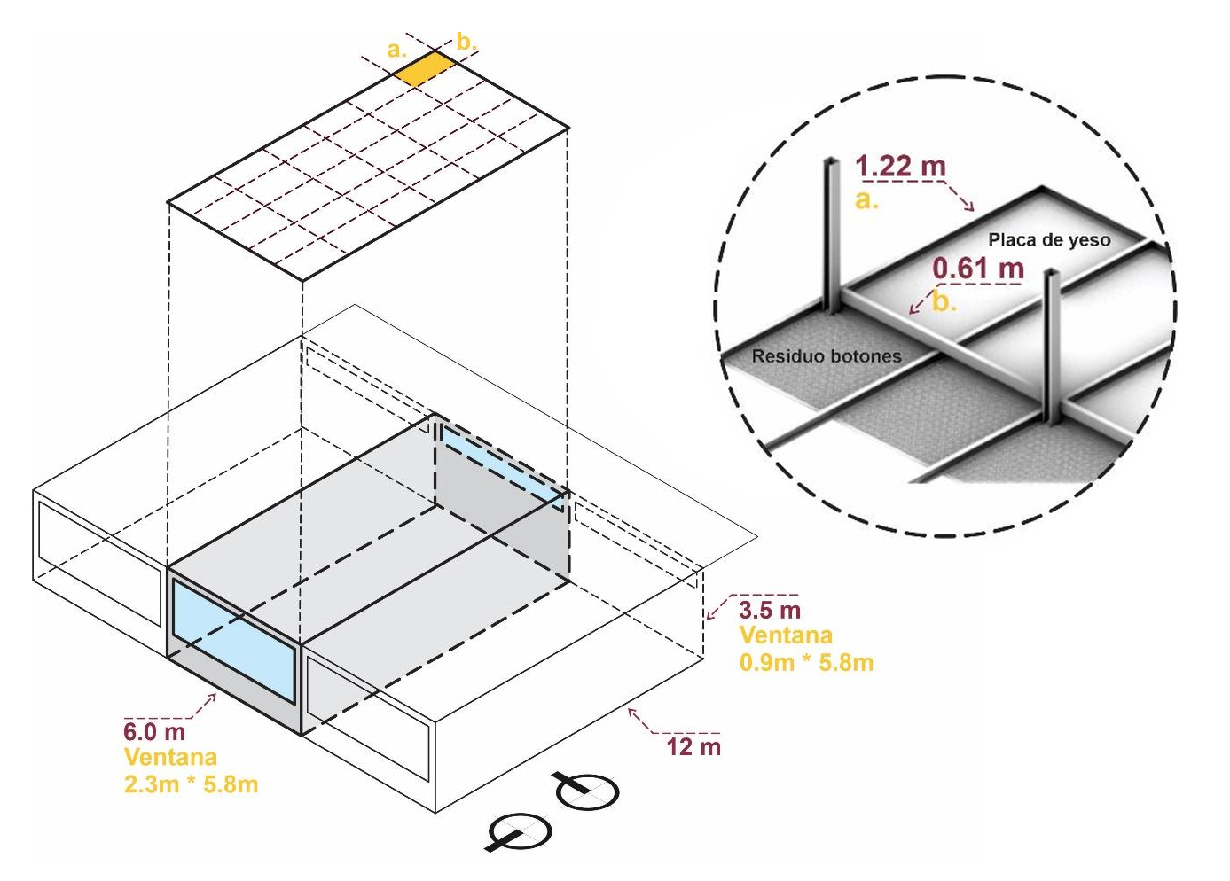 Con el objetivo de medir el desempeño y las posibilidades de aplicación del residuo como cielo falso arquitectónico se construyó un modelo hipotético de 6 m de ancho × 12 m de largo y 3.5 m de alto. Sobre este modelo se construyó una subestructura metálica de 0.6 × 1.22 m, dimensiones usualmente utilizadas para instalar placas de yeso o fibrocemento en cielo, pensando en la posible articulación del uso del material propuesto con otros materiales ya utilizados en la construcción y utilizar sistemas de anclaje ya existentes. En ese orden de ideas y considerando que el residuo generado no es homogéneo en color ni forma, sino que depende de la cantidad de botones solicitados, se podría pensar en aplicaciones parciales o zonificadas dentro de ambientes de oficinas sobre áreas que tengan requerimientos particulares en iluminación o absorción acústica. En la Figura 6 se ilustran las condiciones del modelo base.