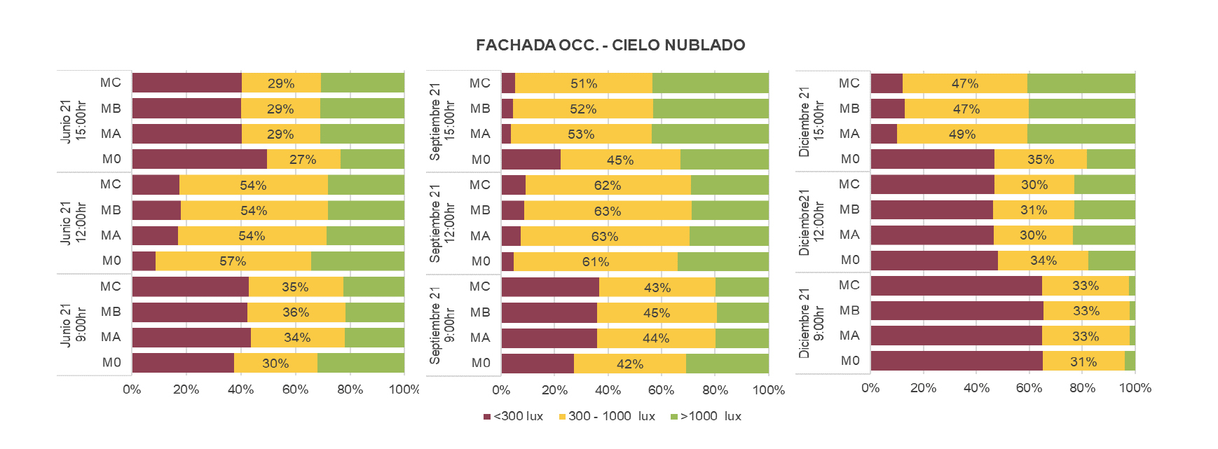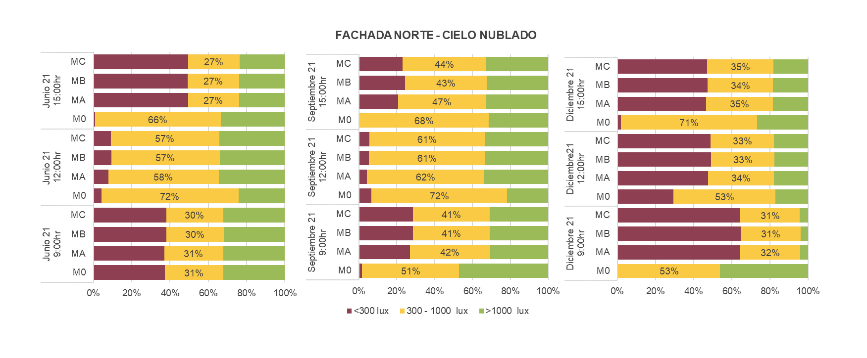 Existen diferentes métricas para cuantificar los ambientes lumínicos interiores, como las que analizan un instante determinado y ciertas condiciones específicas con respecto a la iluminancia, la luminancia o el deslumbramiento (Ministerio de Minas y Energía [Minminas], 2009) y otras que analizan periodos de tiempo tales como el Factor de luz diurna (Daylight Factor –DF–), o la Iluminancia útil de la luz diurna (Useful Daylight Illuminance –UDI–), entre otras (Gene-harn, 2013). Para lograr predecir el desempeño lumínico de espacios arquitectónicos no construidos, usualmente se utilizan software y programas computacionales tales como, Radiance, Daysi, Velux, Avallare, Lightsolve, Spektro, Diva4Rhino, entre otros (Giraldo, 2018).